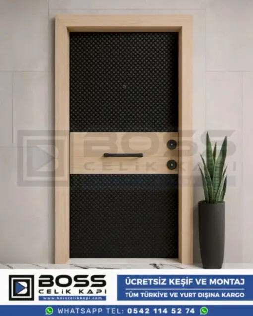 Fotoğrafta gördüğünüz gibi, Viana modelinin en belirgin özelliği, meşe ahşabının yumuşaklığı ile dokulu siyah panelin sert ve dinamik kontrastıdır. Bu kontrast, kapıya anında modern ve derin bir hava katıyor. Kapının orta kısmını yatay olarak kesen düz meşe kaplama, dokulu siyah panelleri dengelerken, kapı kolunun da bu ahşap yüzeye entegre edilmesi, tasarımdaki bütünlüğü ve akıcılığı pekiştiriyor. Boss Çelik Kapı olarak biz, Viana ile 2026 çelik kapı modelleri arasında ezber bozan bir estetik ve güvenlik standardı belirliyoruz. Eğer siz de İstanbul çelik kapı pazarında sıradan tasarımlardan sıkıldıysanız, Viana modeli ile tanışma vaktiniz geldi.
